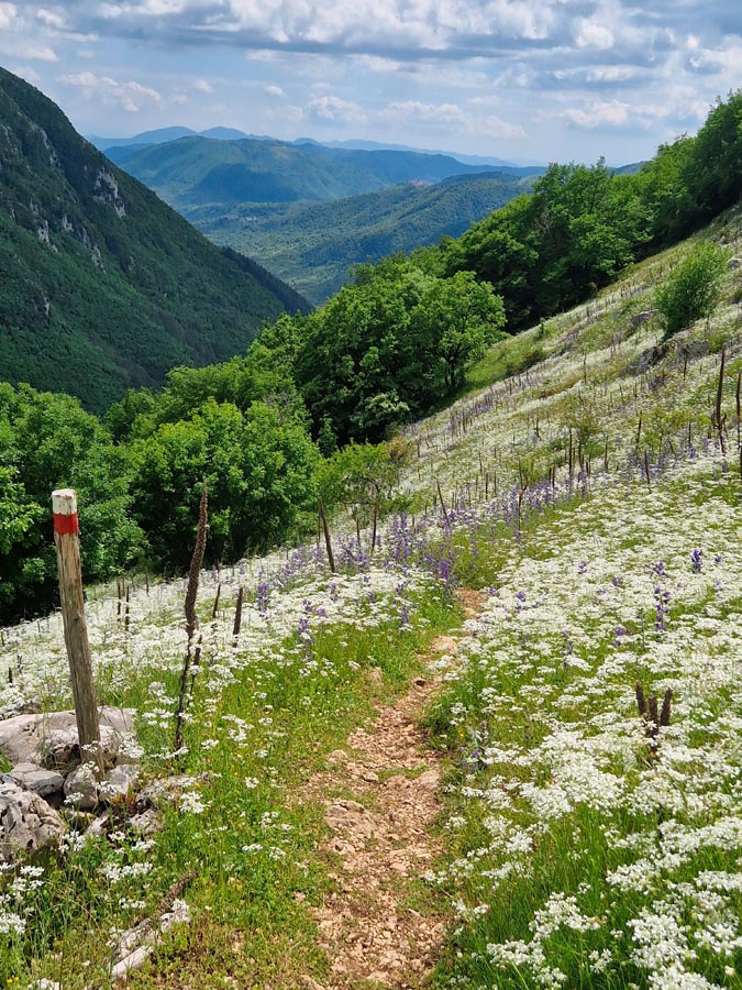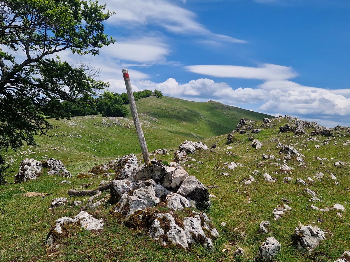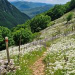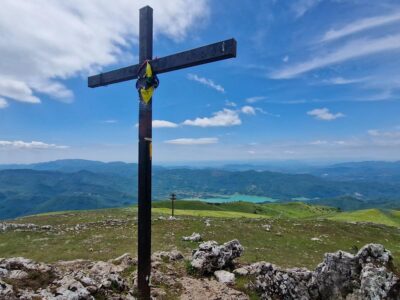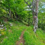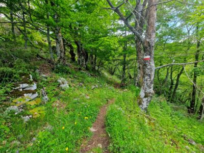 La prima tappa del Cammino del lago Turano, lasciando Castel di Tora accanto alla caserma dei Carabinieri, incontra la piccola fontana di San Nicola dove riempiere le borracce per poi seguire le indicazioni per la cascata delle Vallocchie. Quando si raggiungono gli agriturismi, è possibile deviare per visitarla: (deviazione 800mt, TRACCIA – https://out.ac/IeFuVE , si consiglia però di farlo durante la tappa n. 6, che passa nuovamente in questo punto in senso inverso). Si continua a salire lungo una strada in cemento con pendenza elevata ma regolare fino a raggiungere la strada asfaltata, di cui si percorre un breve tratto prima di deviare a destra sul sentiero – utilizzato anche dal CNP – Cammino Naturale dei Parchi – che in circa mezz’ora ci conduce al valico di Fonte Raina, punto di ingresso nella Riserva Naturale Navegna-Cervia. Qui si può fare una sosta, fare rifornimento d’acqua ammirando il vicino borgo dei pastori di Vallecupola (deviazione 2,5km – TRACCIA – https://out.ac/IeFuBn) e poi imboccare il sentiero 321, facente parte del Sentiero Italia del CAI, che tra faggete e praterie con cavalli e mucche al pascolo, porta in circa 3 chilometri e 450 metri di dislivello alla vetta del Monte Navegna (1508 m). Dalla cima si gode un panorama straordinario sui laghi del Turano e del Salto e sulle principali montagne del Lazio e dell’Abruzzo, dal Terminillo al Gran Sasso e al Velino.